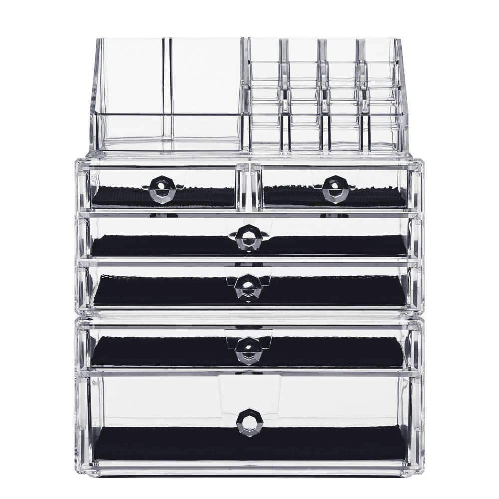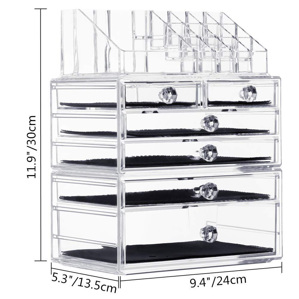 【製品仕様】上段サイズ:21*12*8 16ブロック;中段サイズ:24*13.5*11 4つの引き出し;下段サイズ:24*13.5*8 2つの引き出し:ブロックと引き出しのサイズも色々あって、ご希望通りに違う品物が収納できます。引き出しに中敷きが付いていて、ジュエリーなどが滑りにくいし、傷つきません。